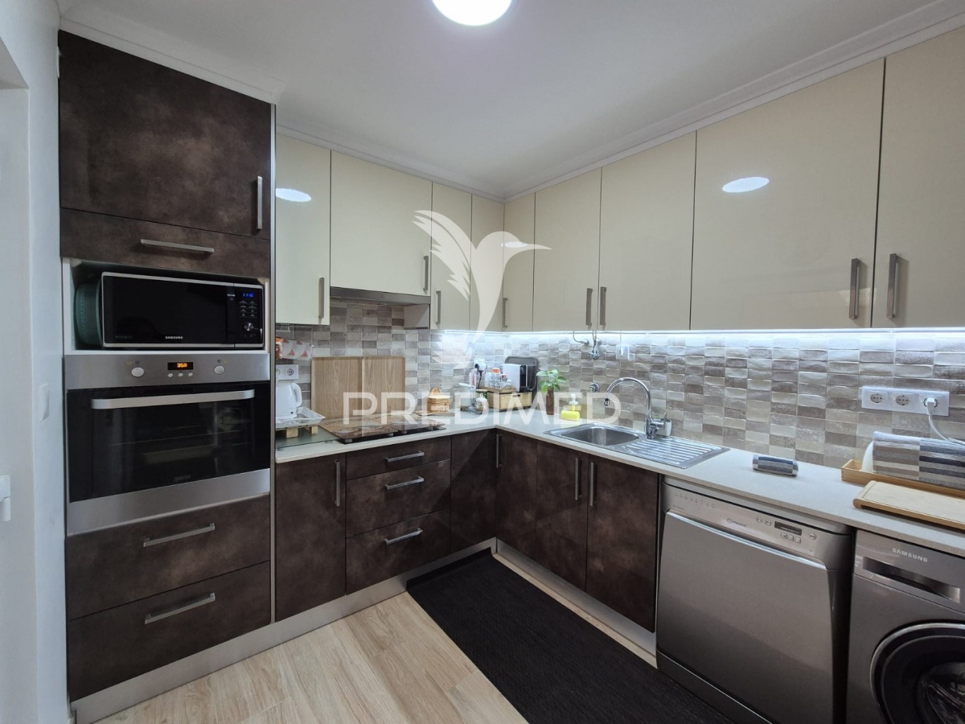 Cozinha equipada com placa de vitrocerâmica,forno,exaustor, máquina de lavar roupa e loiça,