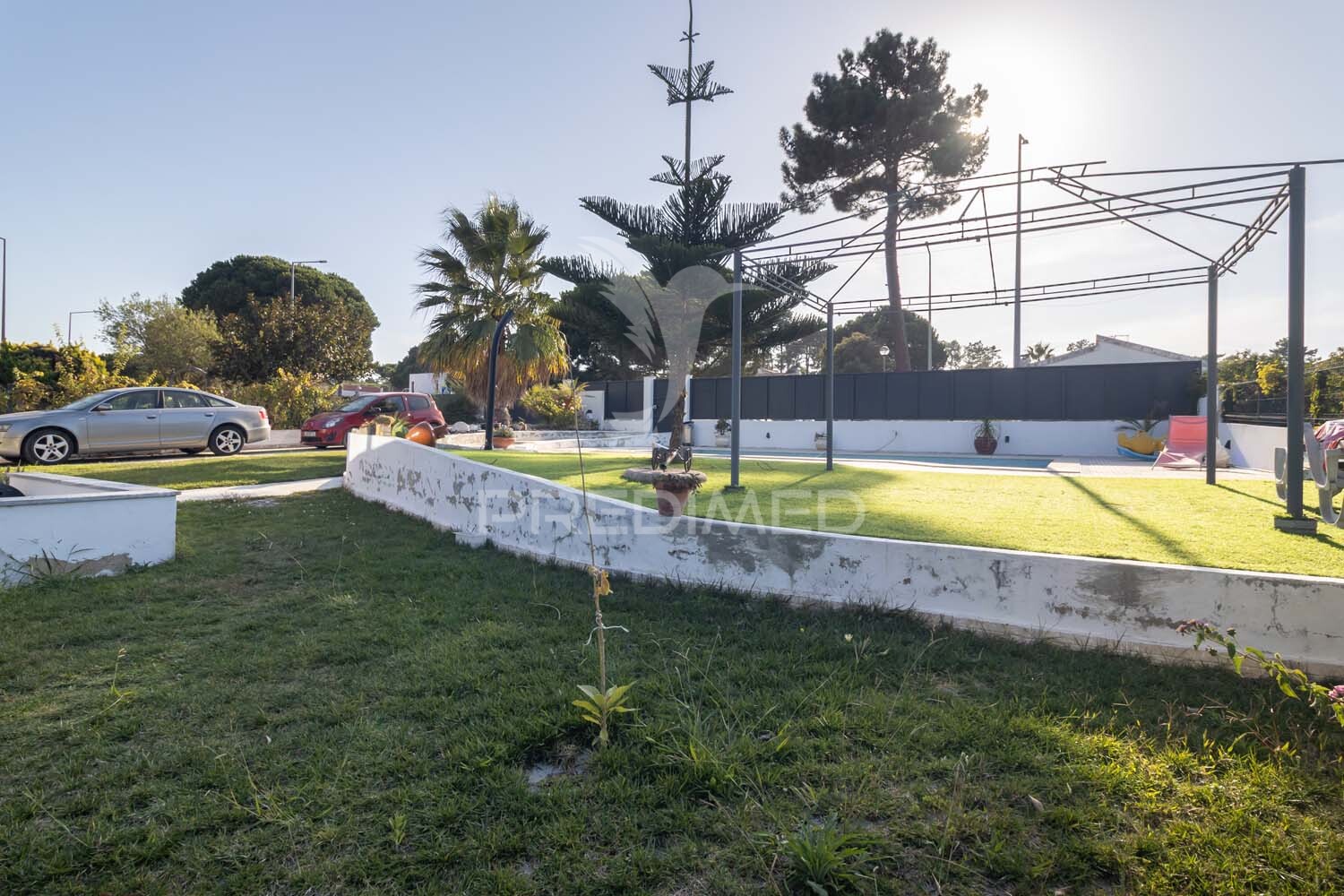 Zona relvada e horta com árvores de fruto