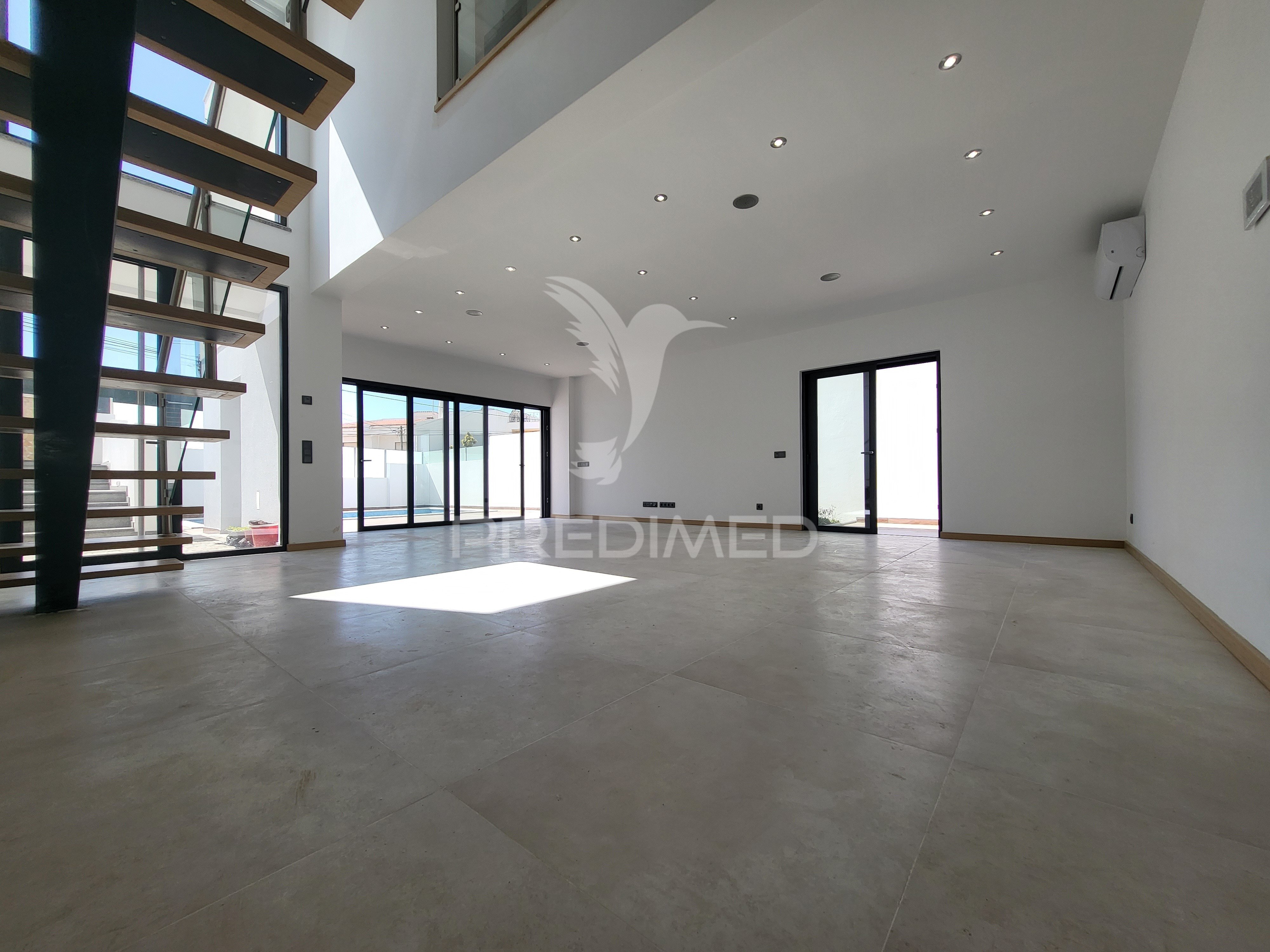 Planta baja - Salón amplio con aire acondicionado, sistema de sonido ambiental y acceso a la piscina, cocina completamente equipada con acceso a la barbacoa, 1 baño y garaje.