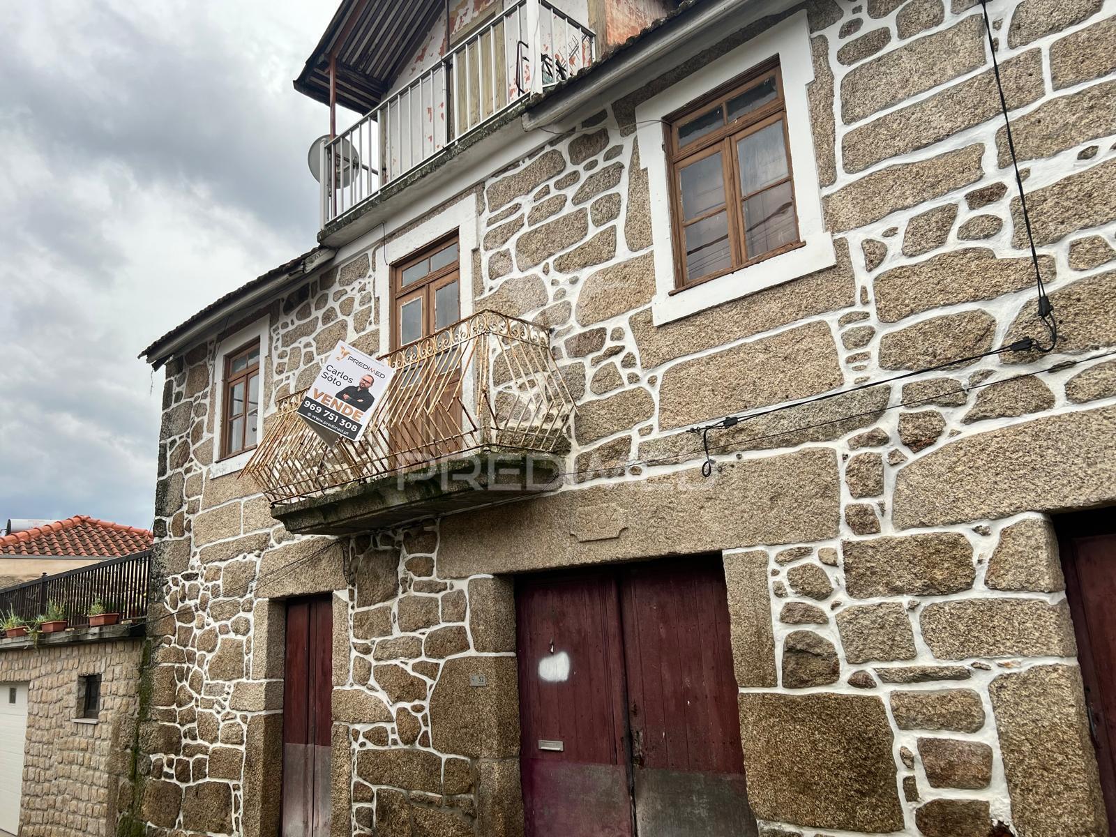 Maison en granit avec façade restaurée, comprenant rez-de-chaussée, premier et deuxième étages, ainsi qu’un chalet.