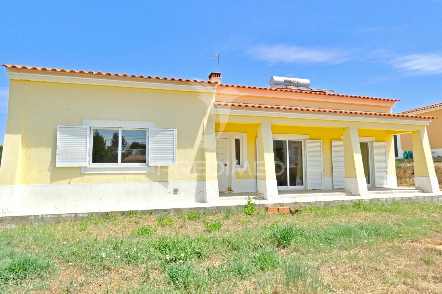 This property features aluminum window frames with double glazing and white exterior shutters. Water heating panels with thermosiphon deposit.