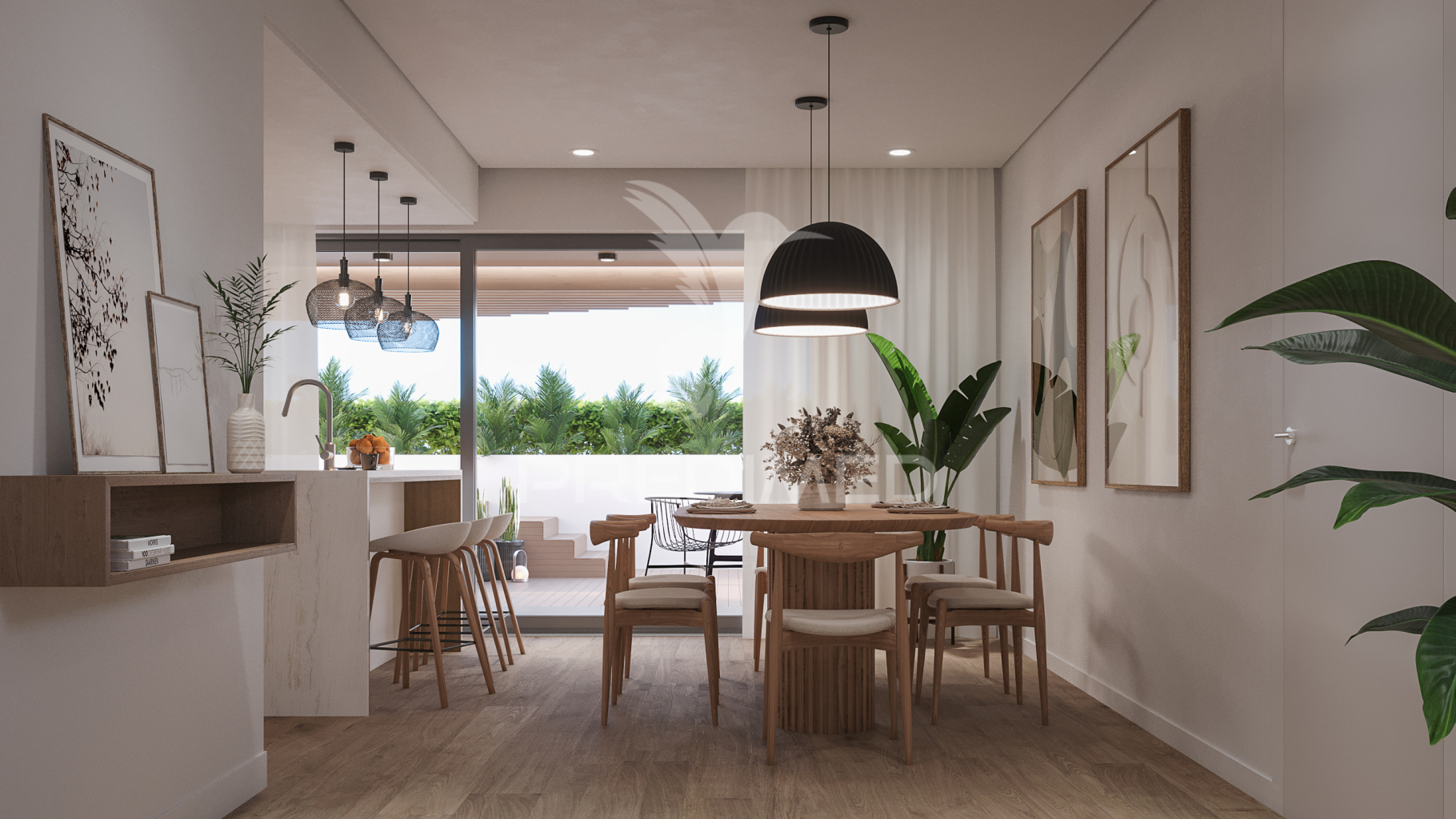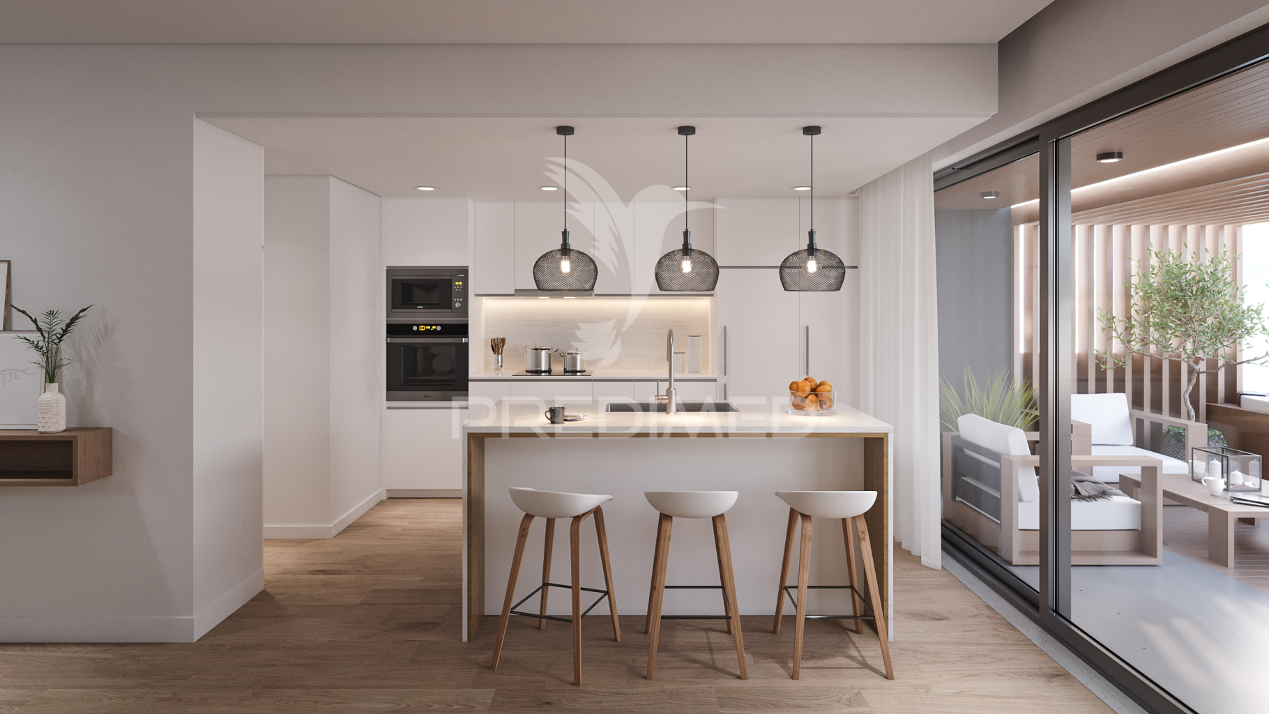 Open plan kitchen and living room with access to the terrace