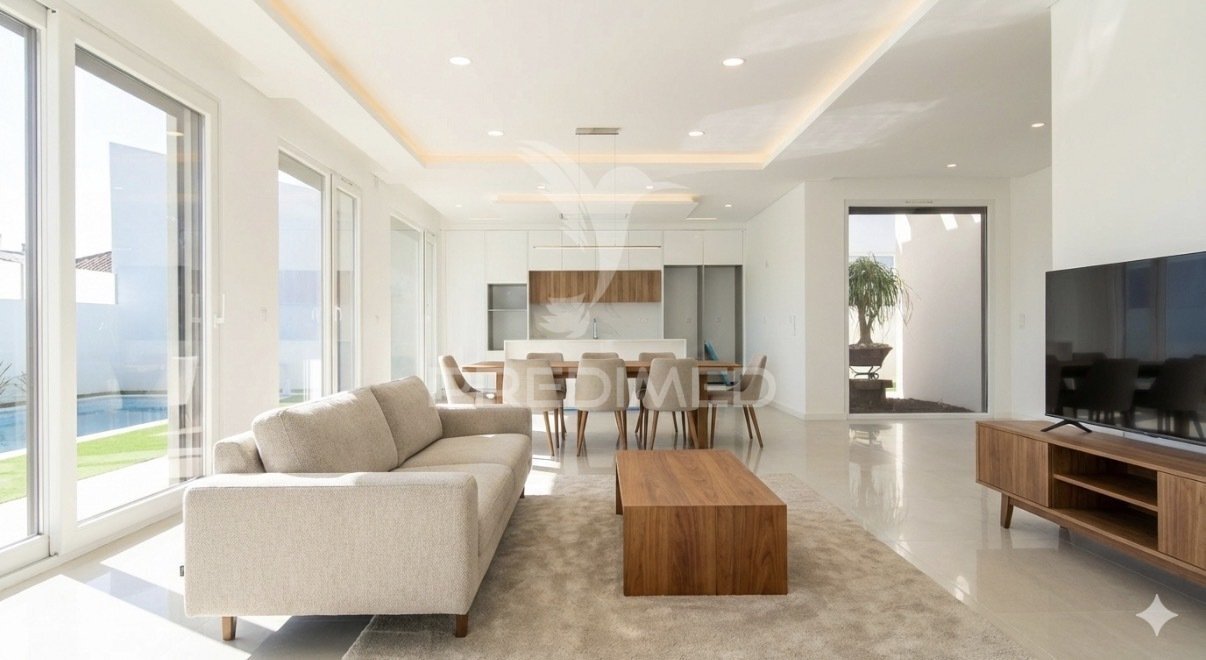 Ao entrar, destaca-se a ampla sala em open space com 63 m², com vista direta para o jardim e para a piscina. A cozinha com ilha integra-se harmoniosamente neste espaço, oferecendo funcionalidade tanto na preparação de refeições como nos momentos de convívio.