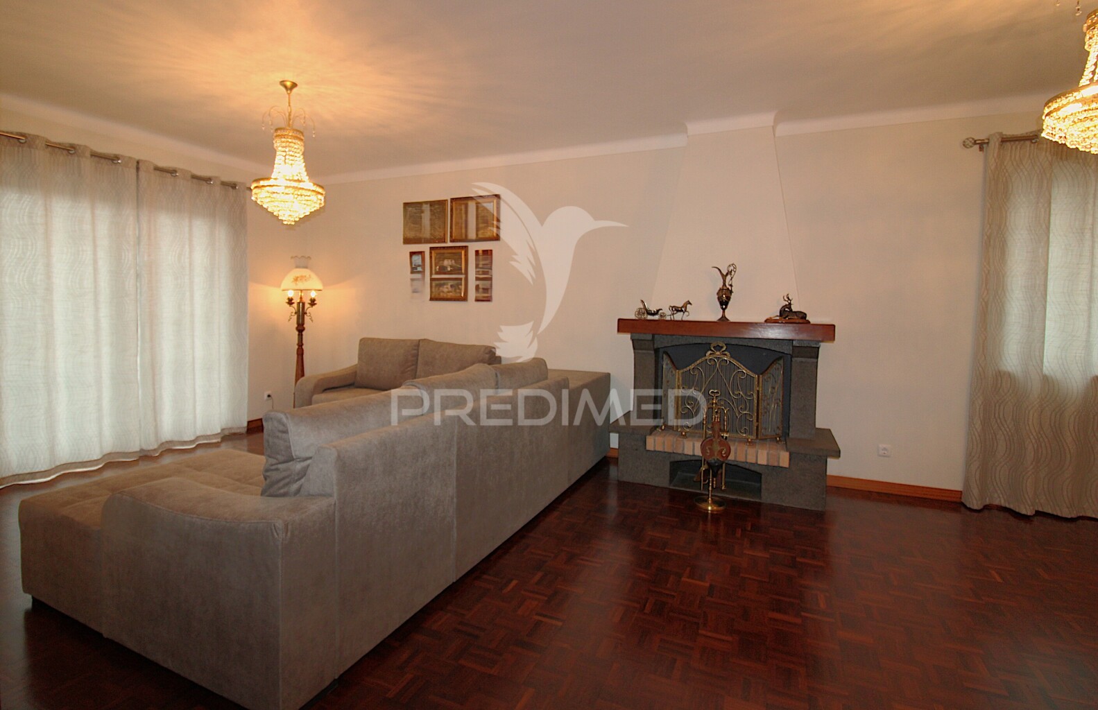 Sala de estar com lareira, e varanda com vista mar.