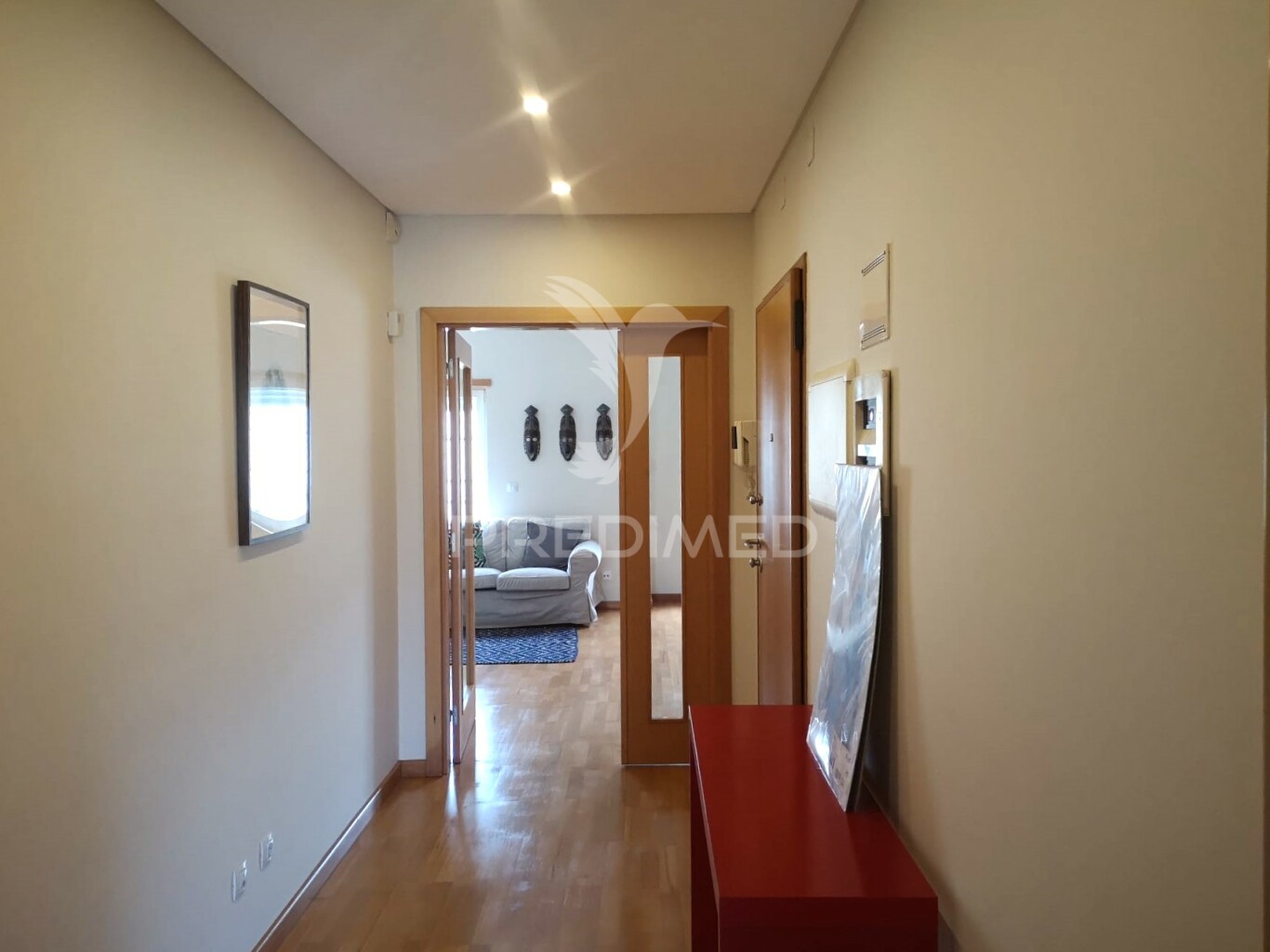 O apartamento tem dois quartos com roupeiro, sala com recuperador de calor, chão flutuante, vidros duplos, estores elétricos, gás canalizado, ar condicionado num dos quartos e sala e aspiração central, que conferem conforto e um bom desempenho térmico.