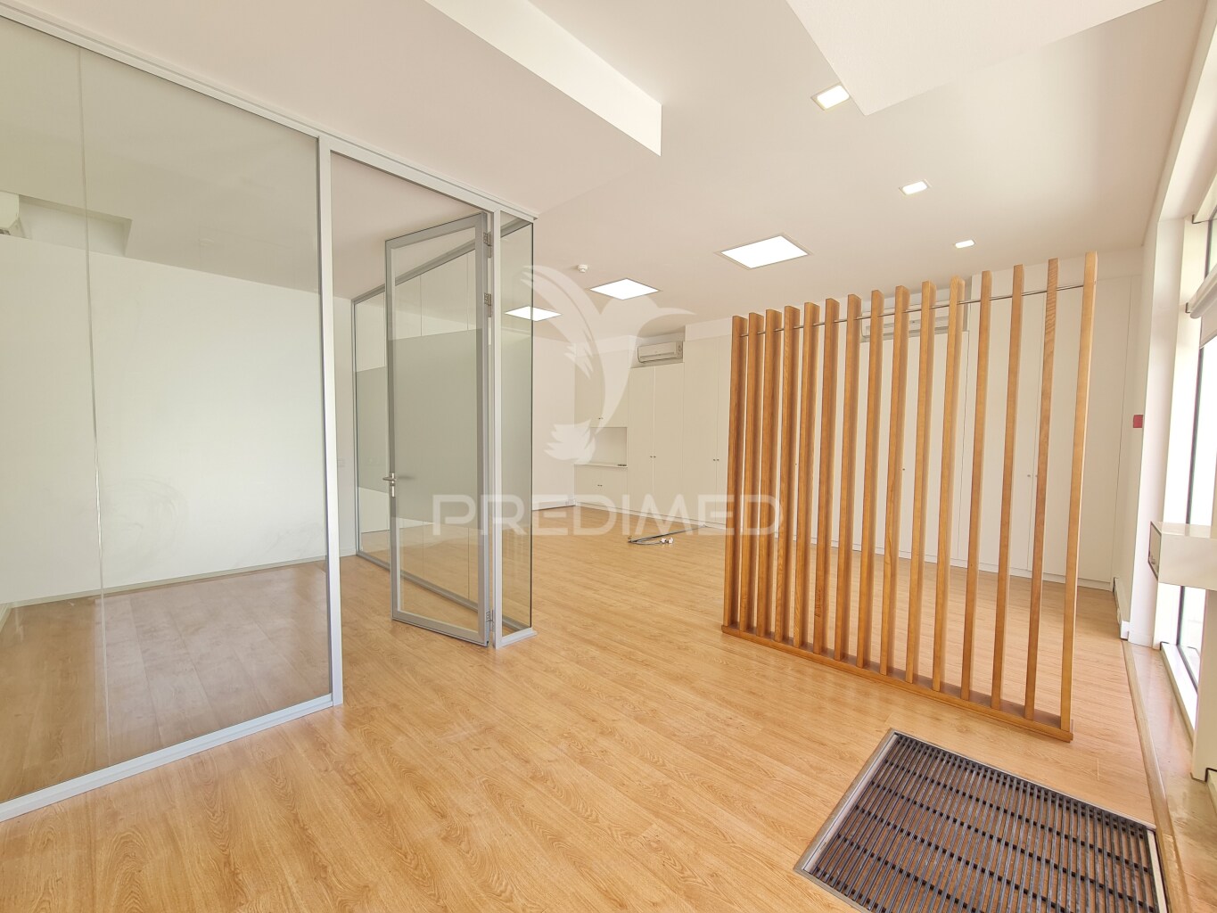 - ar condicionado; piso flutuante de madeira; luzes embutidas no teto; parede lateral forrada com armários embutidos, porta exterior metálica de enrolar, para segurança e sinalética exterior para publicidade já aprovada e existente.