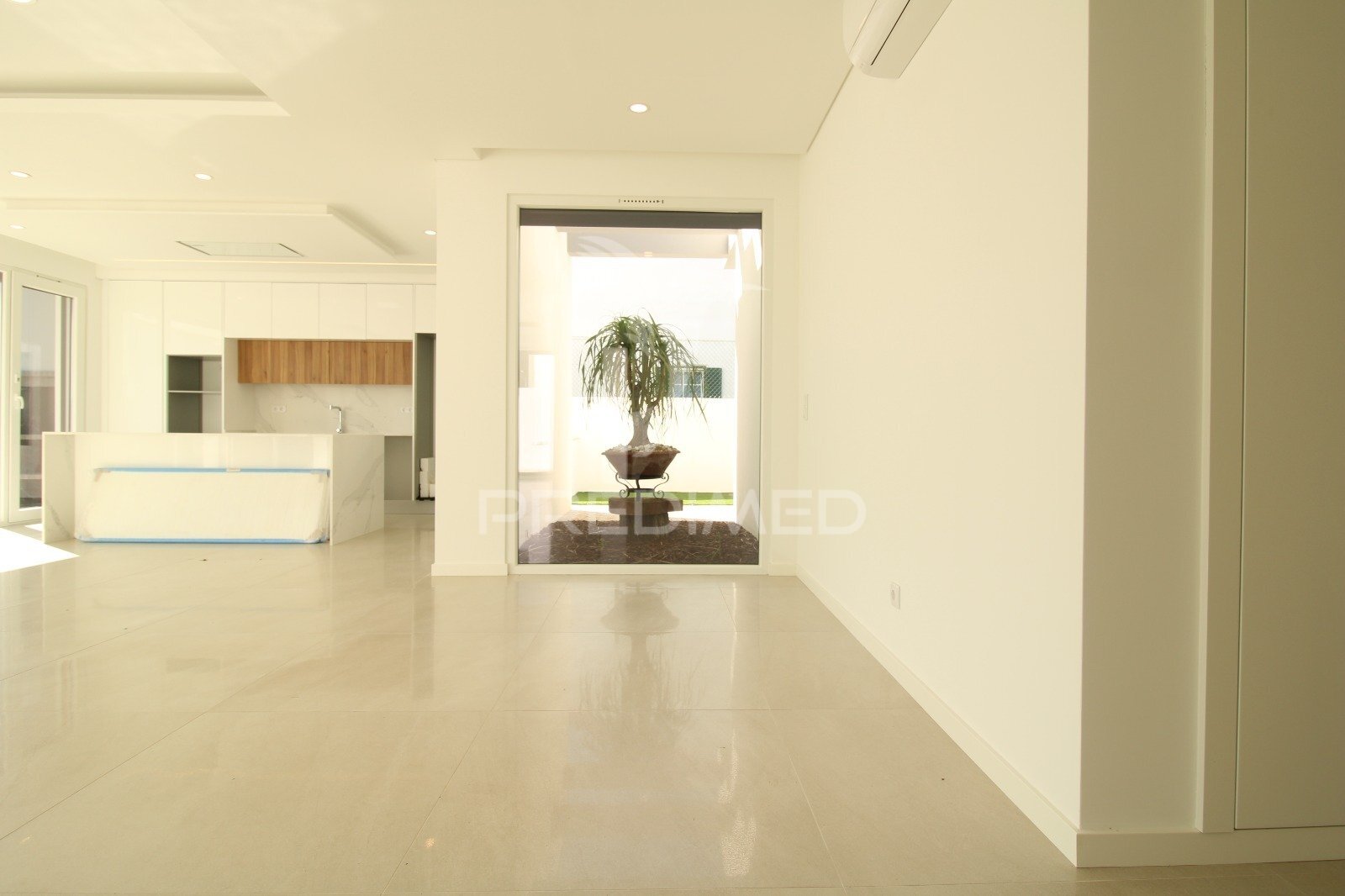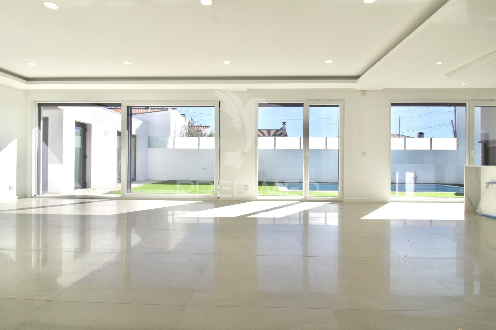Ao entrar, destaca-se a ampla sala em open space com 63 m², com vista direta para o jardim e para a piscina. A cozinha com ilha integra-se harmoniosamente neste espaço, oferecendo funcionalidade tanto na preparação de refeições como nos momentos de convívio.