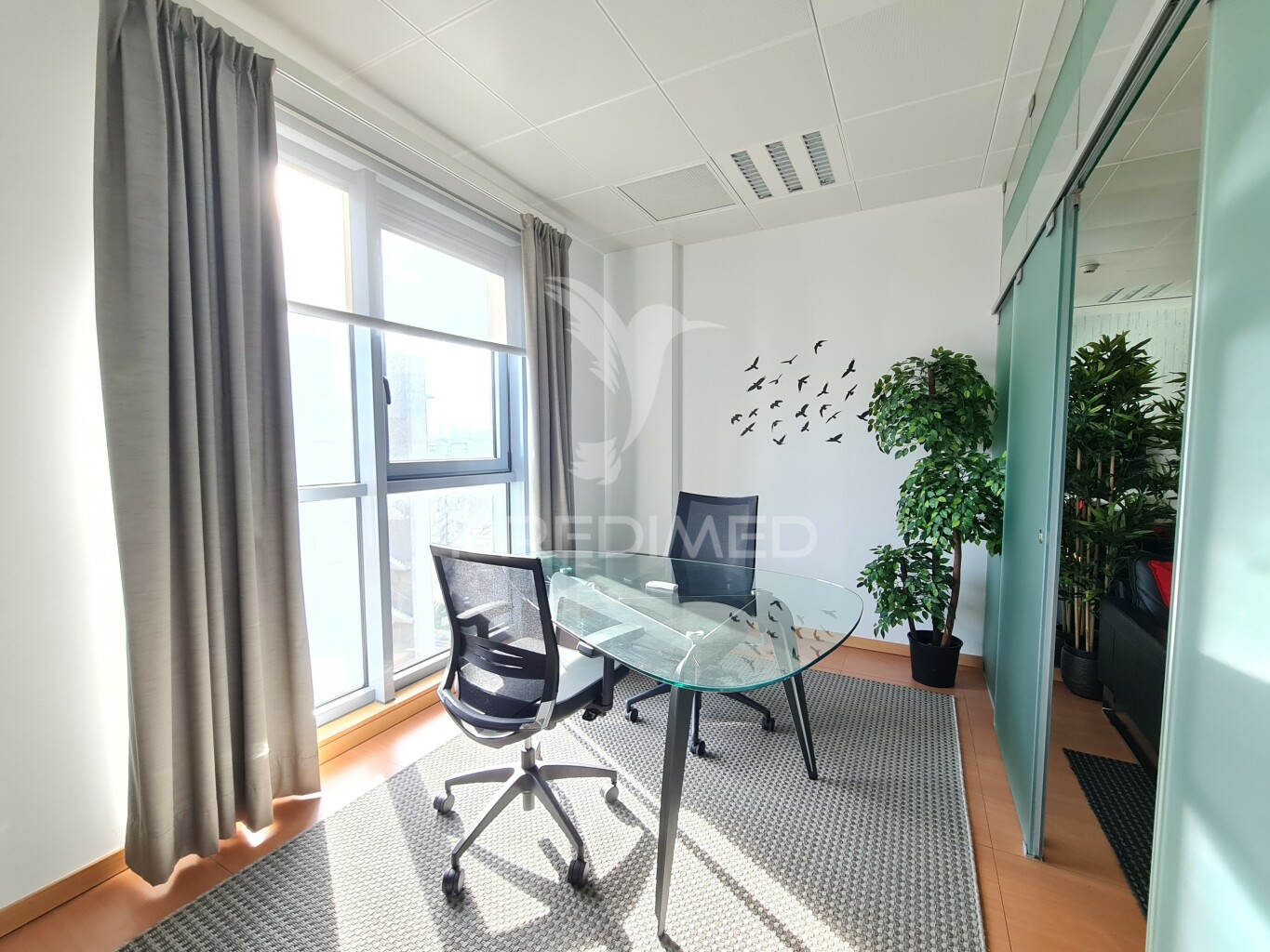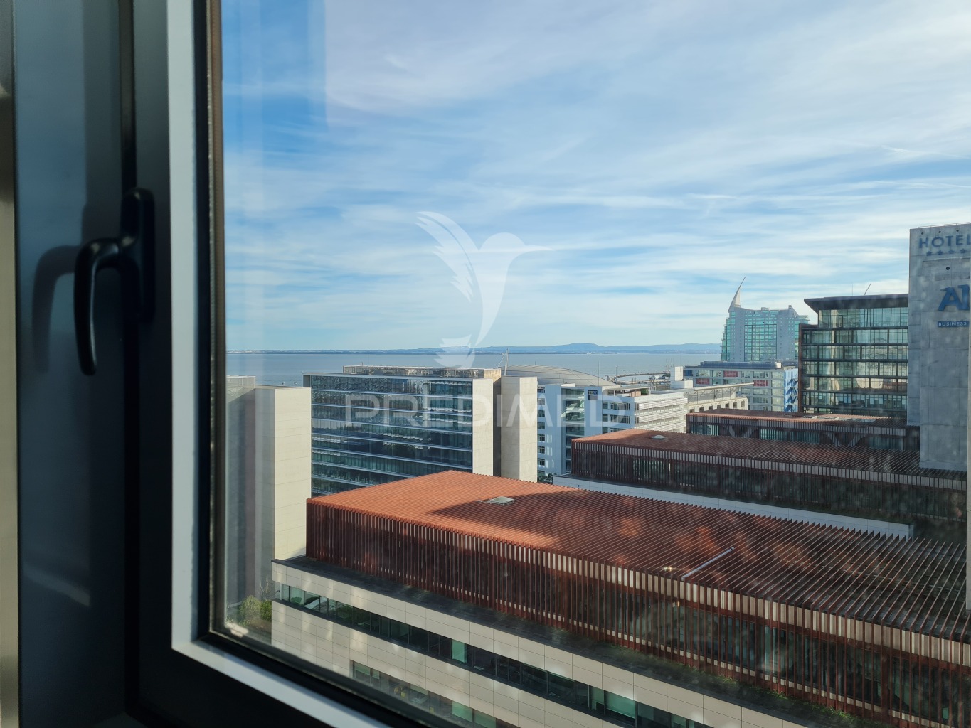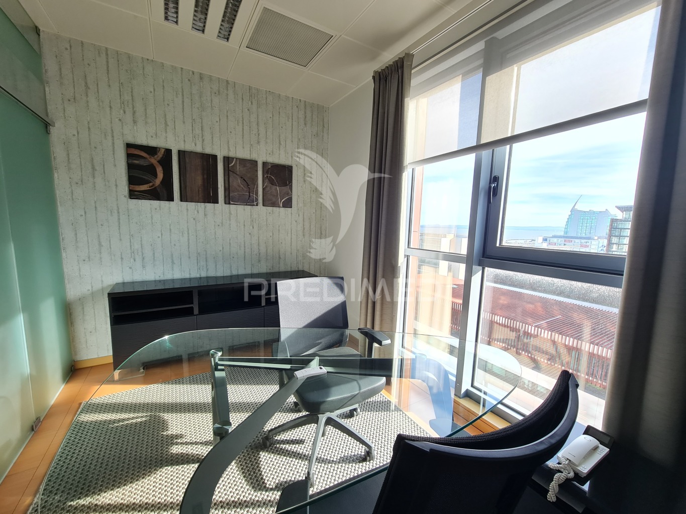 Exclusive office for rent with 33 useful m2, private bathroom and 1 parking space (44 m2 gross area), in the PANORAMIC Office Center, in Parque das Nações, in Lisbon.