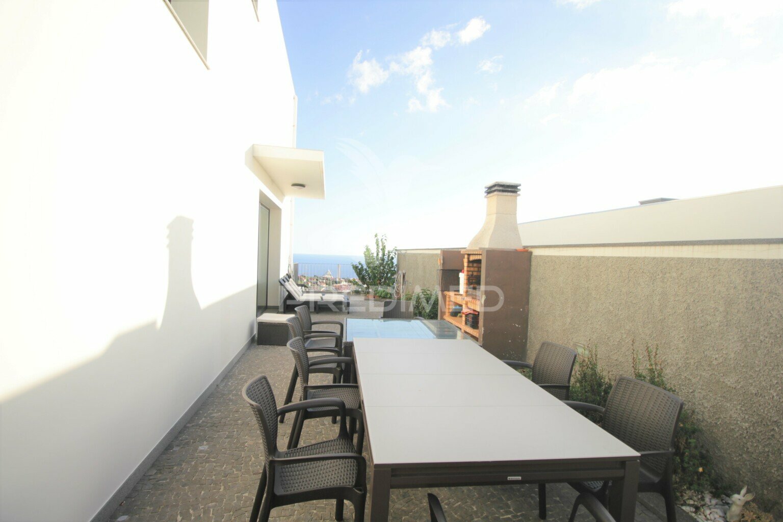 Sala de jantar e estar com acesso a logradouro com vista mar, uma ampla cozinha com acesso direto ao logradouro e churrascaria onde pode realizar os seus convívios e convidar todos os seus amigos e familiares, lavandaria, 1wc social e um quarto que poderá ser utilizado como escritório ou um quarto quarto de dormir.