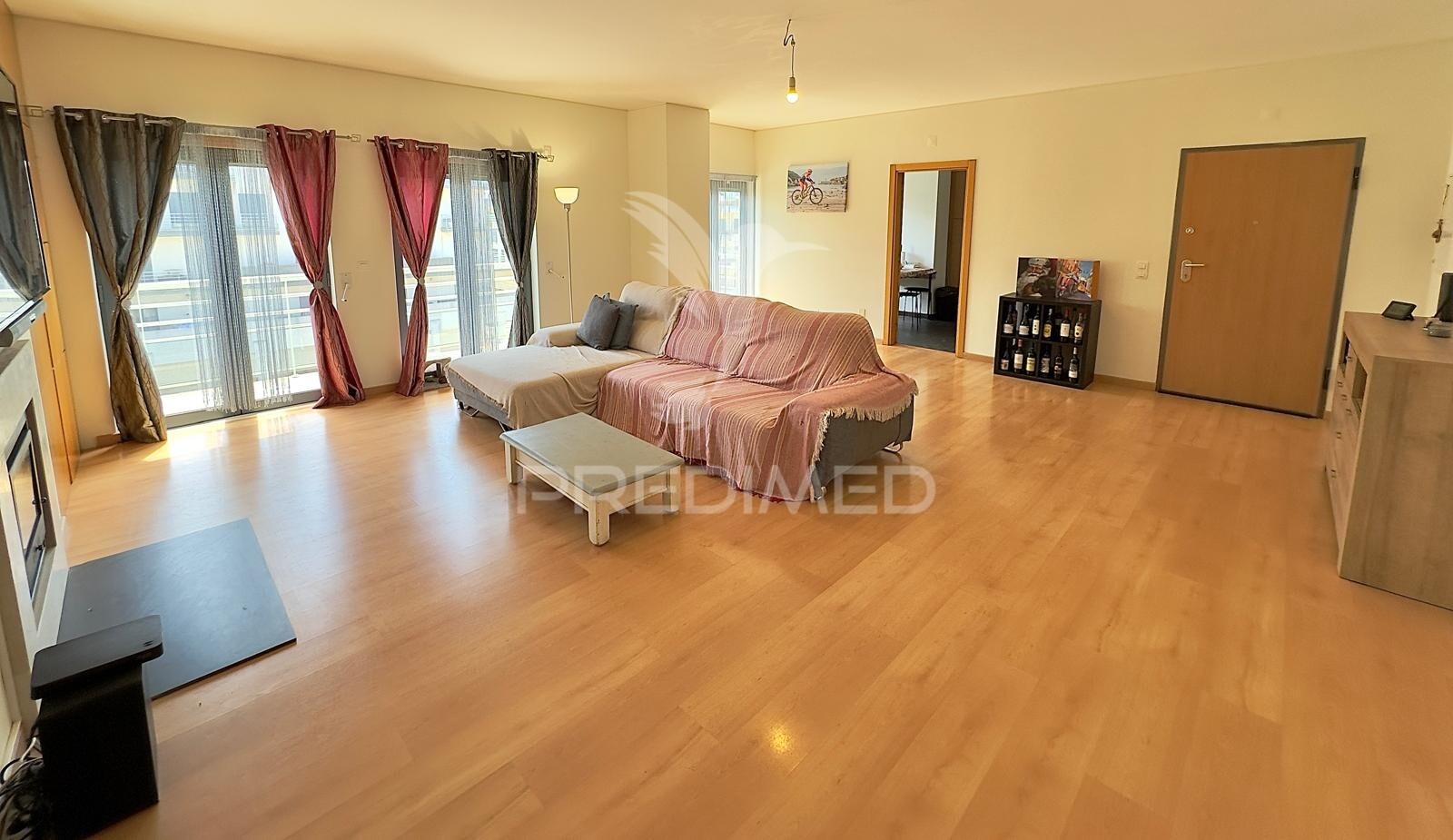 Großes Wohnzimmer mit Klimaanlage und Kamin, ideal für Komfort zu jeder Jahreszeit.
