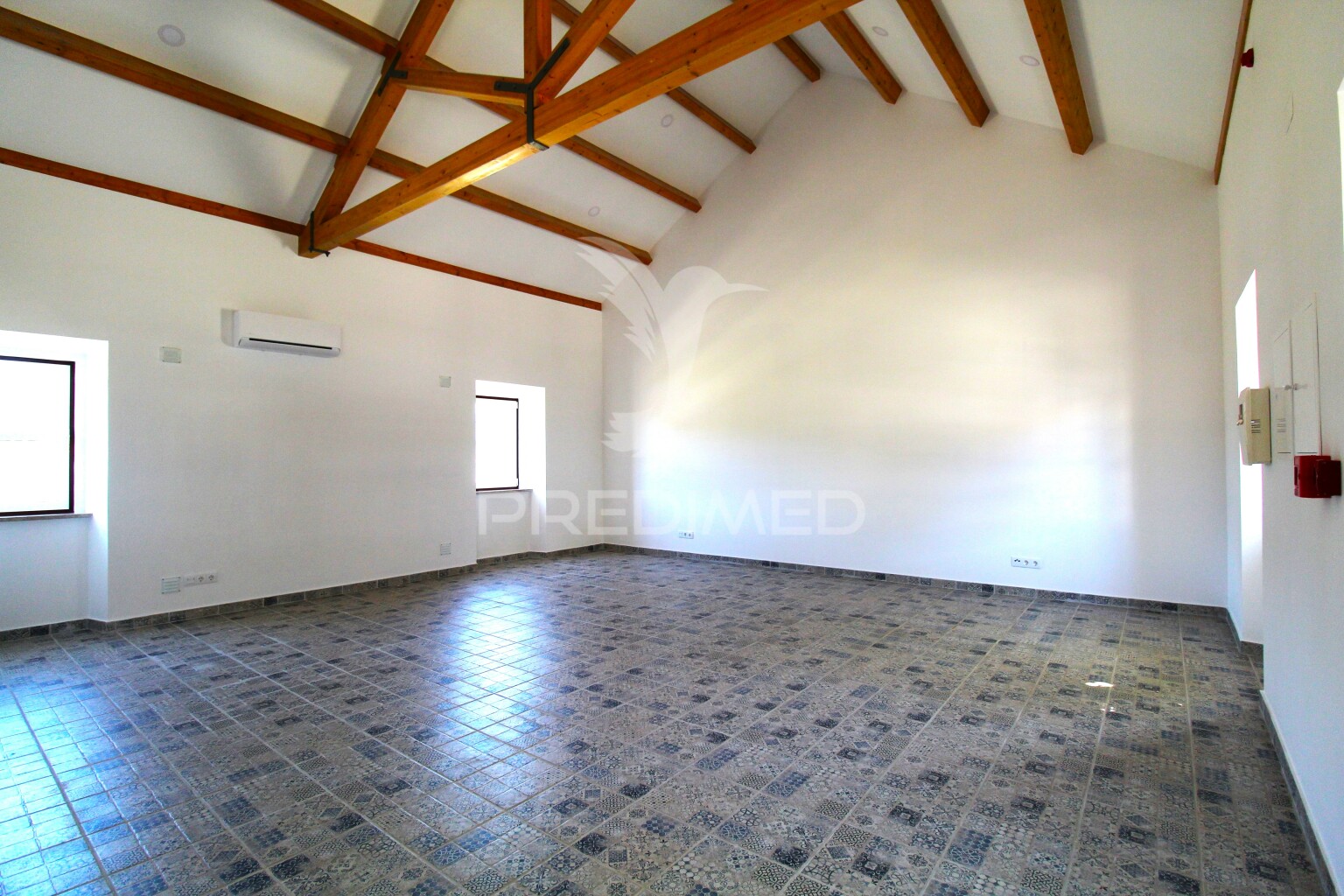 Großer, heller Raum mit Vorinstallation von Klimaanlage, Rauchmelder, Glasfaser und Telekommunikationsnetz.