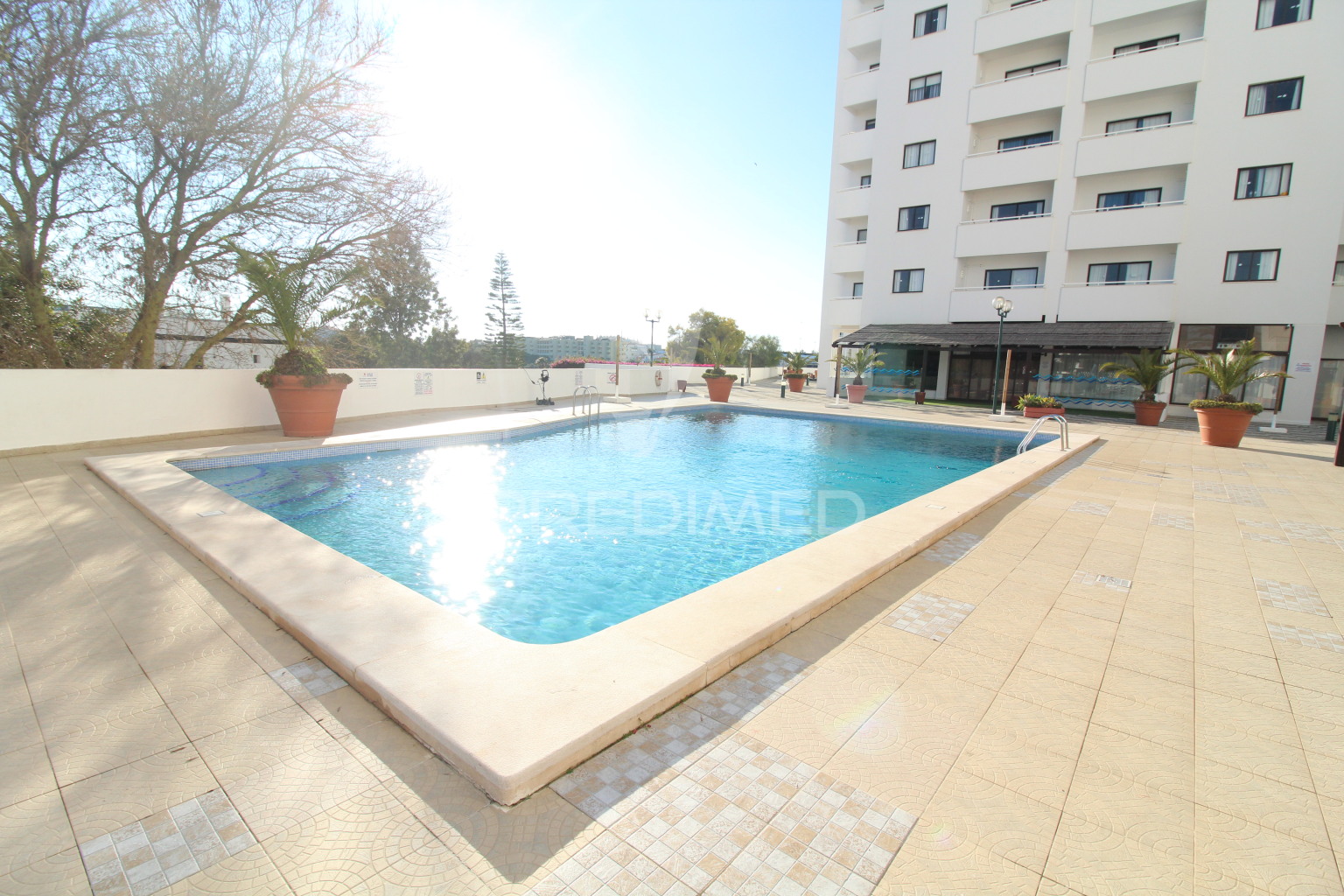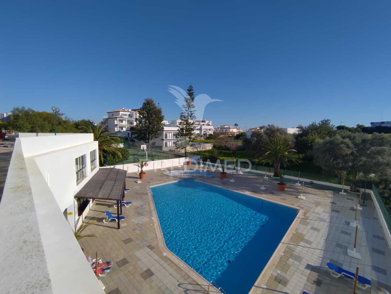 Las zonas comunes exteriores constan de 2 piscinas exteriores para adultos y una para niños, pista de tenis, pista de vóley playa, mini golf y varias zonas de entretenimiento con mesas de ping pong y zonas ajardinadas.
